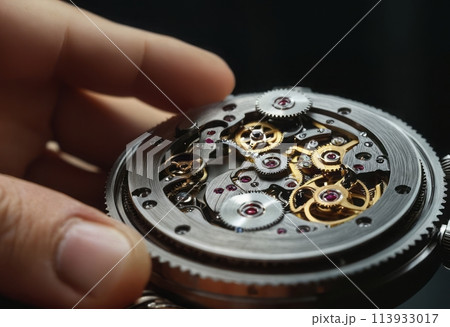 Close-up of a watchmaker holding an intricate watch mechanism. Precision and craftsmanship in horology.