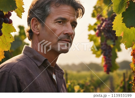 A mature man in a contemplative mood standing amidst a vineyard. He appears introspective against the backdrop of grapevines.
