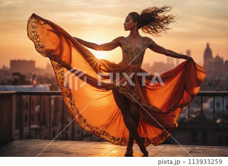 A dancer twirls on a rooftop at sunset, her dress flowing. The city skyline is the backdrop to her graceful motion.