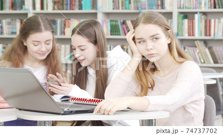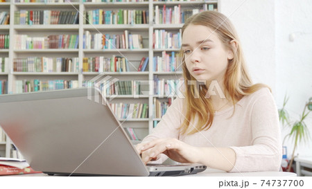 Teenage girl looking away thoughtfully while working on laptop at the library