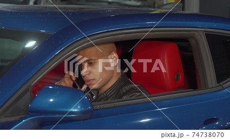 Cheerful handsome African man smiling to the camera while sitting in his car