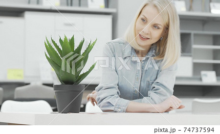 Beautiful woman smiling to the camera holding potted aloe at furnishings store