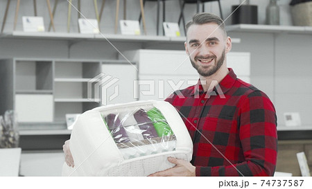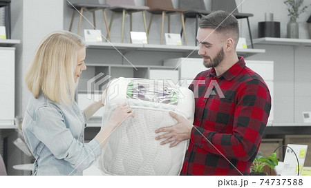 Happy couple smiling to the camera while shopping for pillows at furnishings store