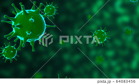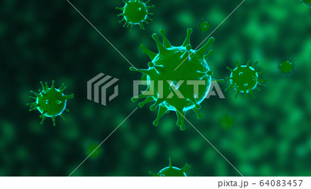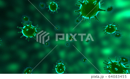 Viruses, Virus Cells under microscope, floating in fluid with green background. Pathogens outbreak of bacterium and virus, disease causing microorganisms. COVID-19 Coronavirus.