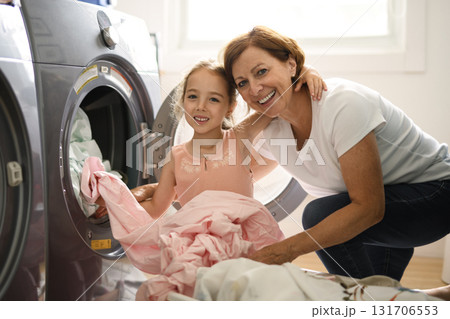 Beautiful grandmother and littlechild having fun and smiling while doing laundry at home.