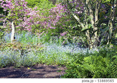 Vibrant pink rhododendron, green fern, blue flower