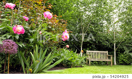 wooden bench in an English garden with pink peony