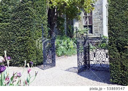 garden open black iron gate between trimmed hedge