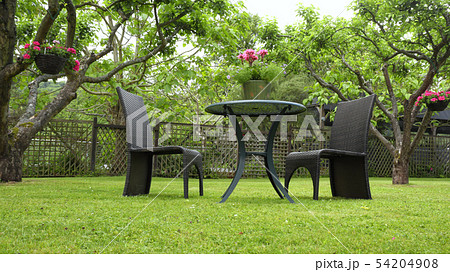 Garden rattan chairs and table with flower pot