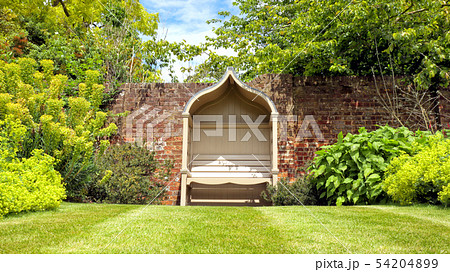English tree garden with sheltered wooden bench