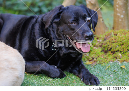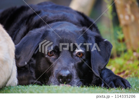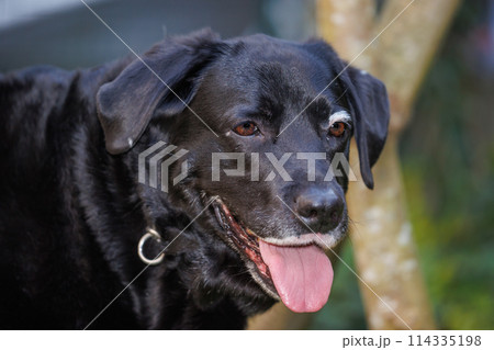 黑色拉布拉多獵犬的臉傾斜著頭,盯著某物