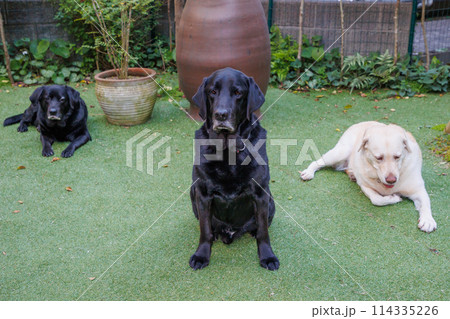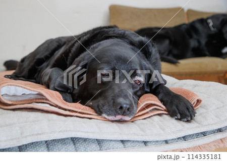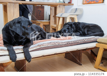 一隻黑色拉布拉多獵犬在室內椅子上放鬆
