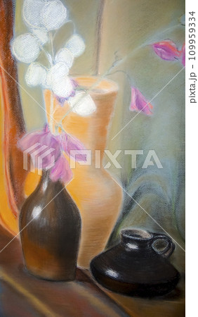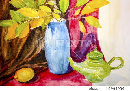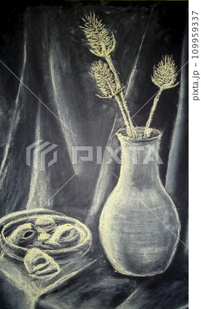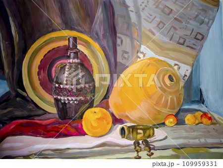 Still life. A painting depicting a still life, a vase, dishes, a bouquet and fruit.