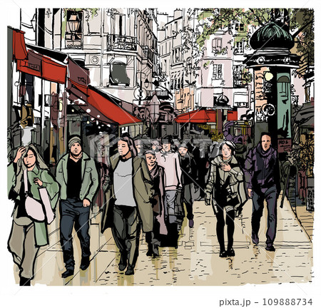 Vector representation of Fresh healthy bio fruits and vegetables market in Montmatre, Paris
