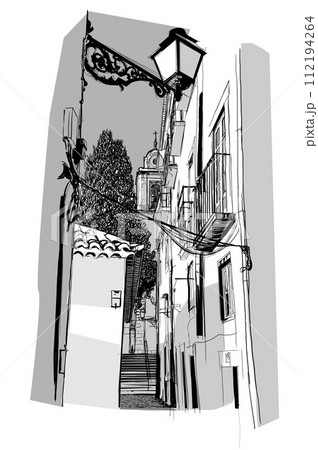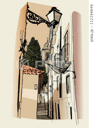 Traditional street in Alfama, Lisbon, Portugal - vector illustration