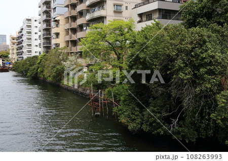 隅田川露台沿線的瓷磚牆和新鮮的綠樹