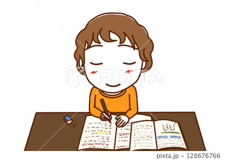 (前上半身)一個白人男孩微笑著努力學習