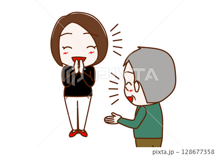 (多位)一名婦女微笑著盡力解釋某件事,一名老人驚慌失措並試圖拒絕