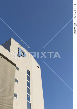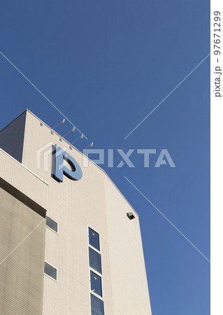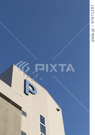 有停車場標誌的大樓 有停車標誌的大樓 有P標誌的大樓 有停車場和藍天的大樓