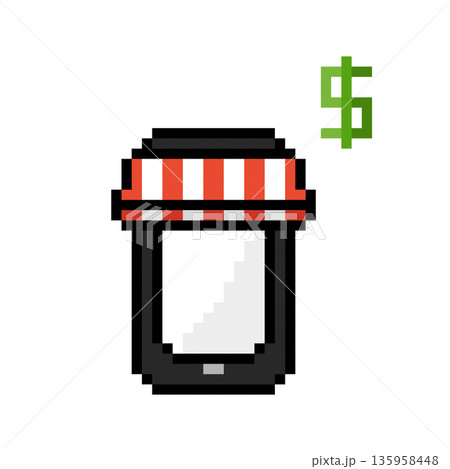 Mobile phone, smartphone with store awning, online shopping concept. Vector icon in 8 bit style