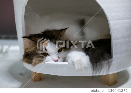 White Exotic Shorthair cat in the circle opening in a wooden box, for pet climbing activity