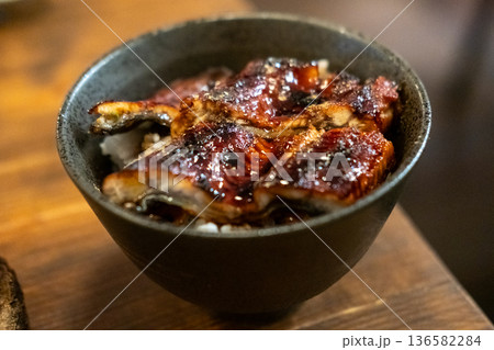 Unagi don. Grilled eel with sweet sauce rice bowl on wooden table.