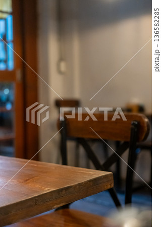 Seating inside the cafe or restaurant, with wooden chairs and table