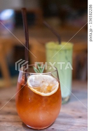 Tropical drink juice, with lemon on top, and green tea latte on the wooden table