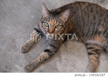Stray cat standing on the floor, looking into the camera