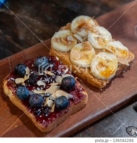 Bread topped with jam, blueberry and fresh banana slices