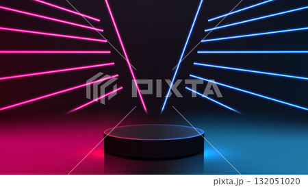 technology podium mockup with blue neon glowing lines on vibrant background for product display or showroom stage with futuristic modern cylinder shape and reflective surface design