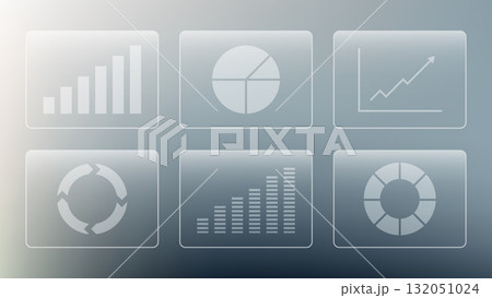 data analytics dashboard design with frosted glass panels showing chart icons bar graph pie chart line graph and business process symbols on gradient background for corporate presentation