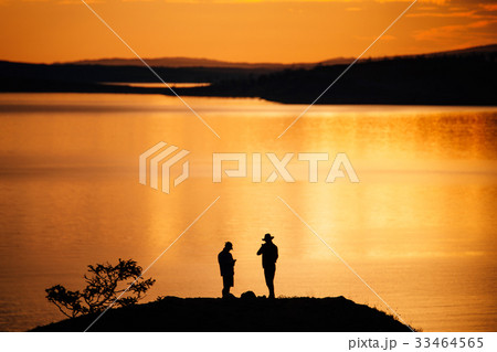 Two men sunrise on lake Baikal landscape