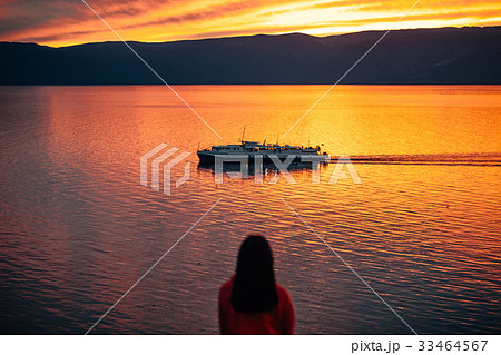 Girl looks at the sunset on the lake cruise boat