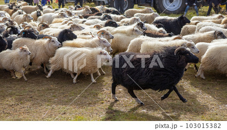 Icelandic Sheep Graze at the Mountain Meadow, Group of Domestic Animal in Pure and Clear Nature. Beautiful Icelandic Highlands. Ecologically Clean Lamb Meat and Wool Production. Scenic Area