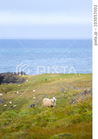 Icelandic Sheep Graze in the Mountain Meadow near Ocean Coastline, Group of Domestic Animal in Pure and Clear Nature. Ecologically Clean Lamb Meat and Wool Production. Scenic Area
