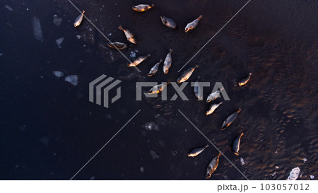 Fur Seals in Natural Environment. Pure Icelandic Nature. Ocean Coast with Floating Ice at Sunset. Wildlife in Iceland. Sea Lions Aerial View.