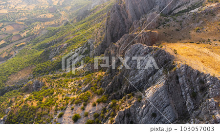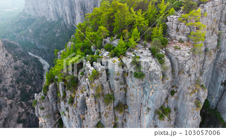 Huge cliffs with forest at summer. Beautiful nature miracle in Turkey. National park area. Pure untouched nature. Dense mixed forest at the top of a mountain cliff.
