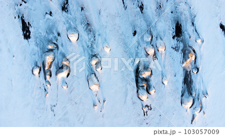 Huge glacier with pure blue ice at sunny weather. Vatnajokull glacier covered snow in Iceland. Beautiful nature abstract background. Ice texture landscape aerial view.
