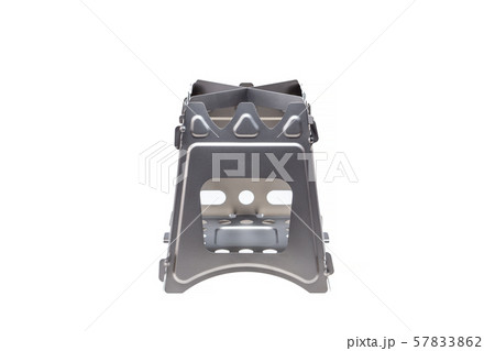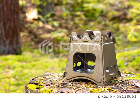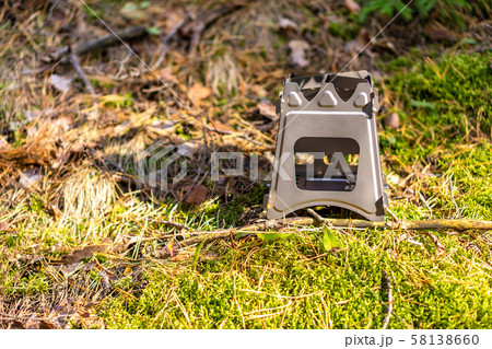 Folding wood stove designed for cooking outdoors using twigs as fuel on nature background