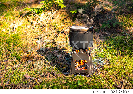 Pot boiling on twig stove outdoors