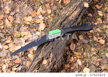 Closeup of a folding handsaw in pouch