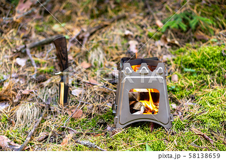 Burning foldable wood stove designed for cooking outdoors using twigs as fuel on nature background