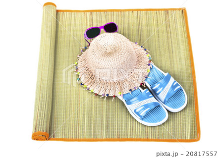 Beach accessories on straw mat over white
