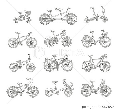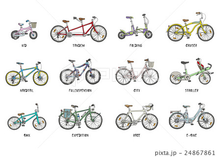 Big hand drawn set of different bicycles.