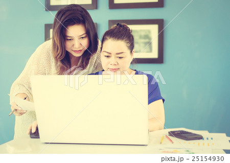 Two business women are working with computer