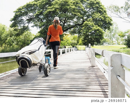 Golf caddy is walking with her trolley