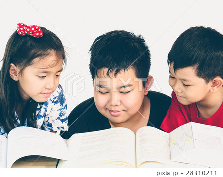 Children are happily reading a book together