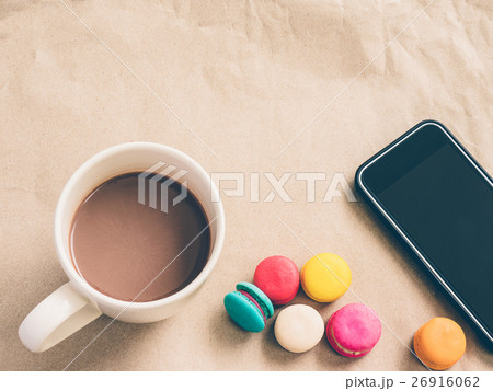 Coffee cup with mobile and macaroon