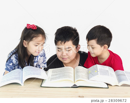 Asian kid is thinking while reading book